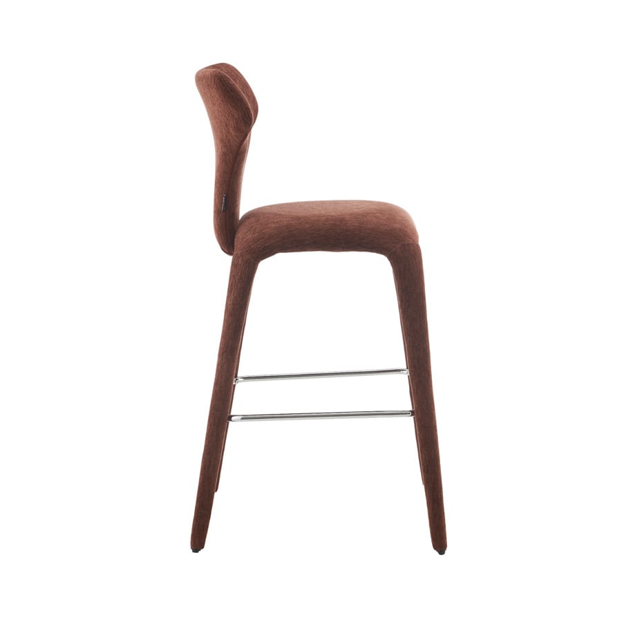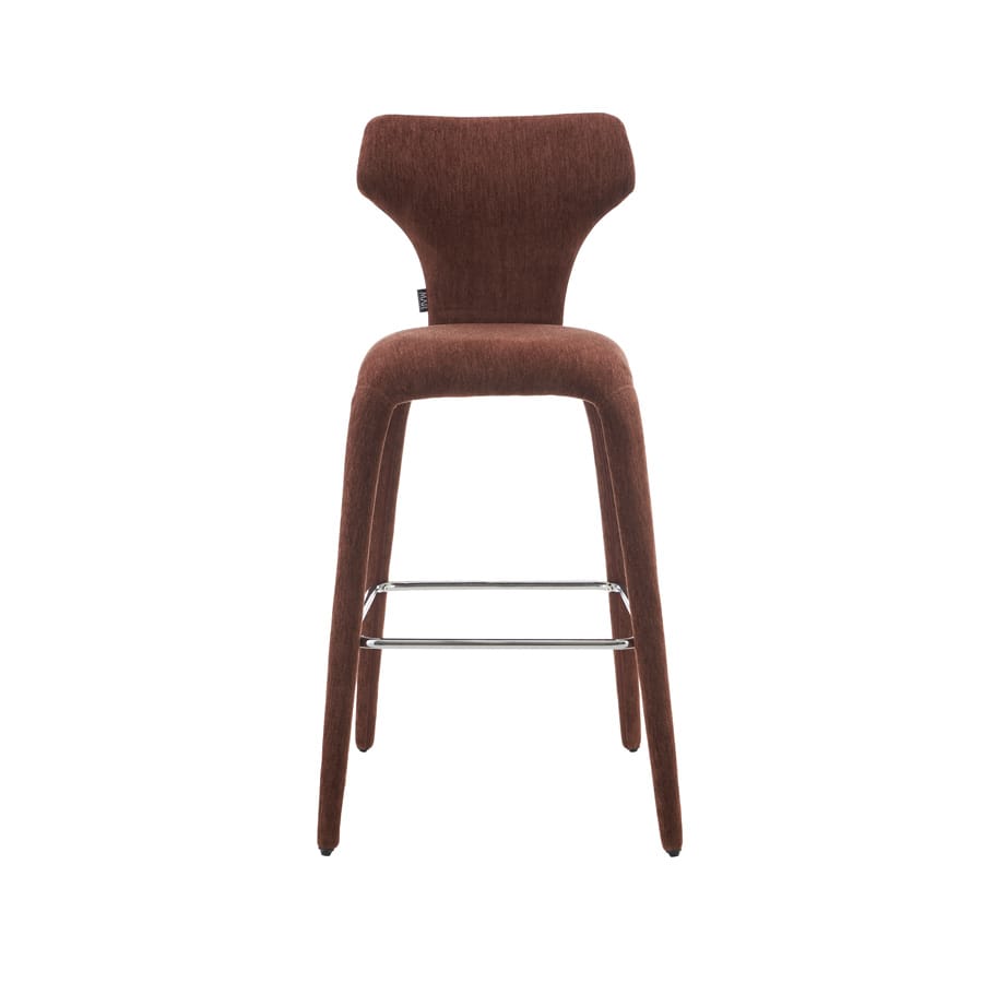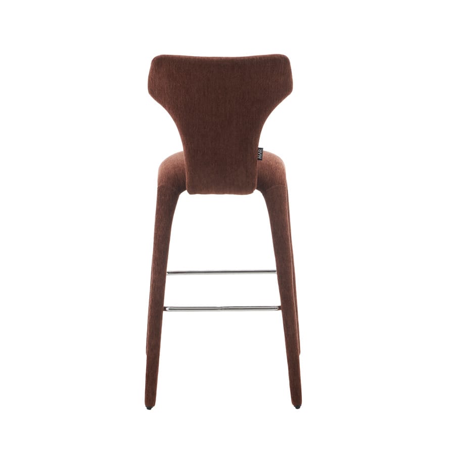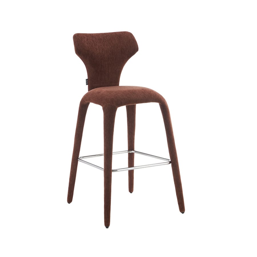 Sculpted Back Upholstered Bar Stool (Brown) Artful organic backrest bar stool in brown textured fabric, with tapered legs and a chrome footrest for a lightweight profile. Merges artistic design with practical seating, suited for breakfast bars, home bars, or casual dining areas—complementing mid-century and modern interiors.