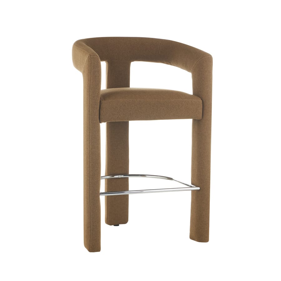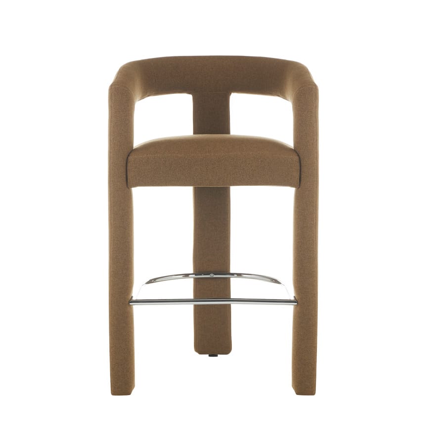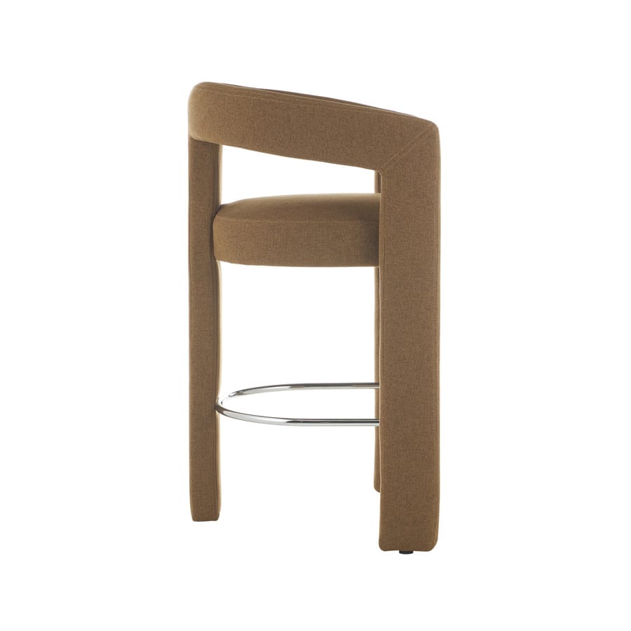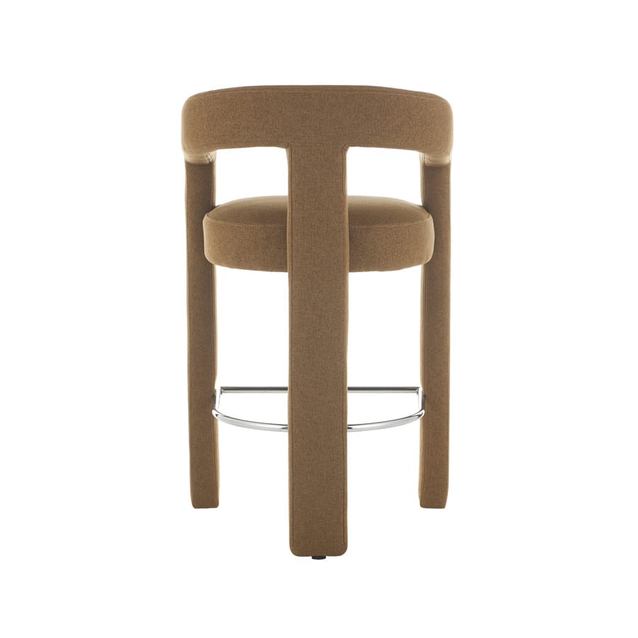 Circular Frame Upholstered Bar Stool (Khaki) Sculptural circular frame bar stool in textured khaki fabric, featuring a thick padded seat and polished chrome footrest. Boasts a bold contemporary silhouette that acts as a statement piece for home bars or dining counters, merging artistic design with comfortable seating for modern interiors.