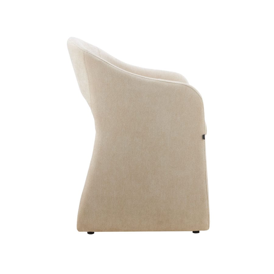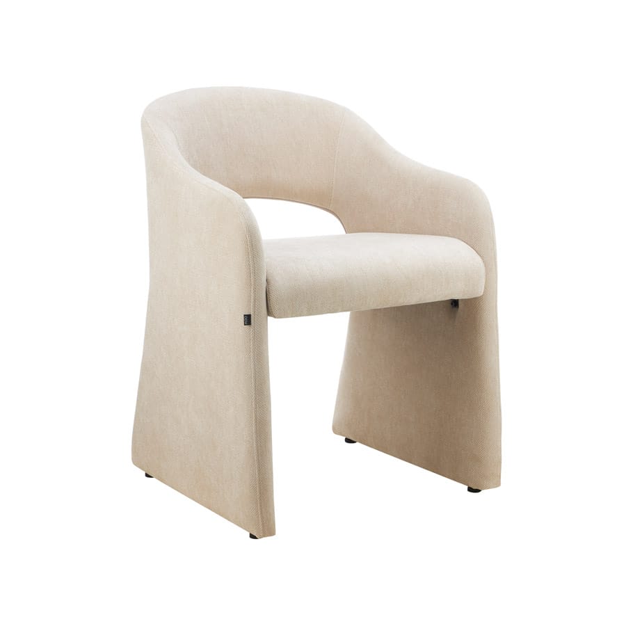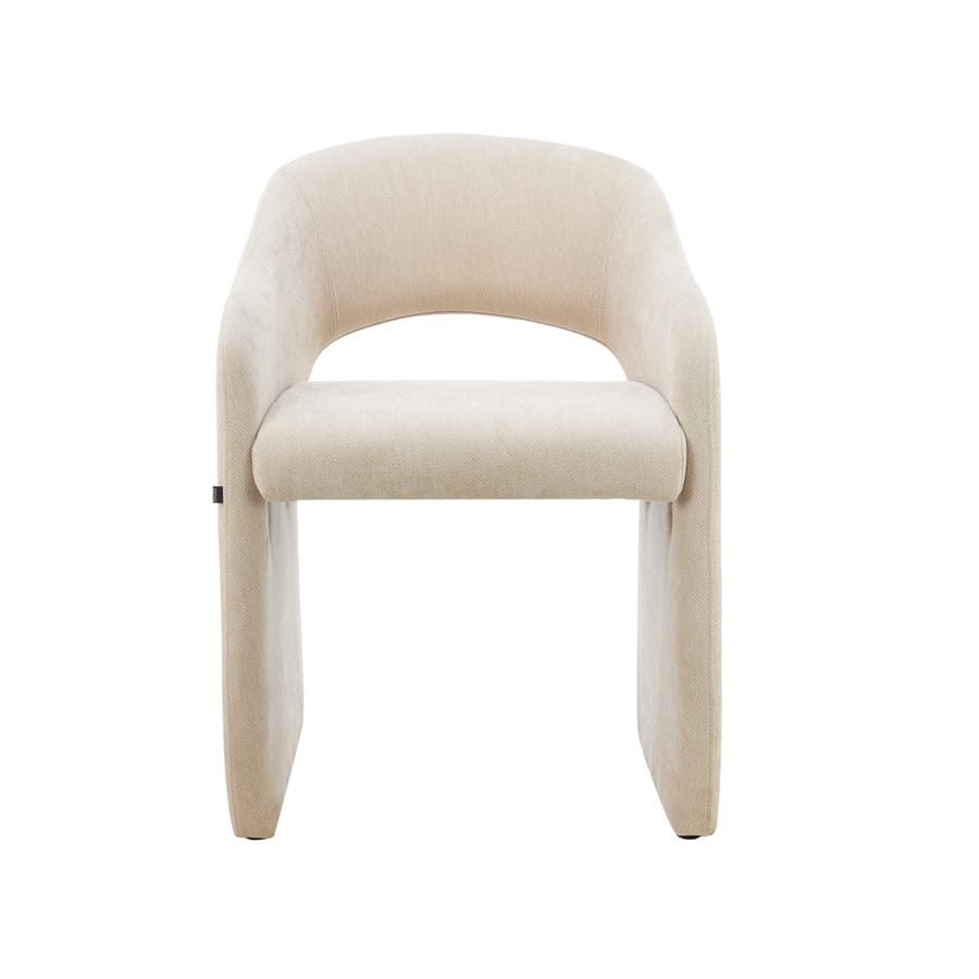 Organic Shaped Upholstered Armchair (Beige) Monolithic curved armchair in textured beige fabric, featuring a seamless one-piece frame and plush seat cushion for optimal comfort. Boasts a dramatic organic design that acts as a statement piece for dining areas, home offices, or lounge spaces—perfect for modern and bohemian decor schemes.